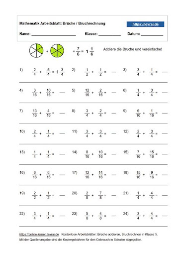 Es gibt viele Arbeitsblätter online und offline, die sich auf das Rechnen mit Brüchen in der 6. Klasse konzentrieren. Diese Arbeitsblätter können Schülern helfen, ihre Fähigkeiten zu verbessern und ihre Kenntnisse zu vertiefen. Einige der besten Arbeitsblätter sind: